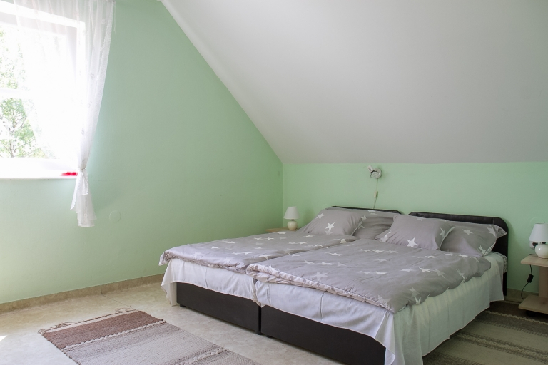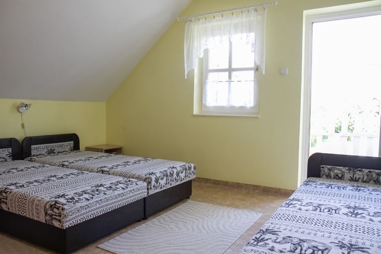 Emelet: Egy kétágyas szoba, egy háromágyas szoba, WC, balkon.